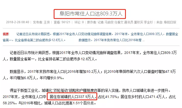 2017底,阜阳市常住人口达809.3万人,城镇化率达到41.75%,市区常住人口337.9万,符合建设要求。